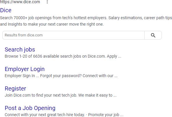 The #1 organic position is occupied by a job search brand called Dice.com, which also has expanded sitelinks and other brand-specific rankings (such as their LinkedIn page). That brand is going to soak up most of the clicks on page one. This is neither a realistic nor desirable keyword.