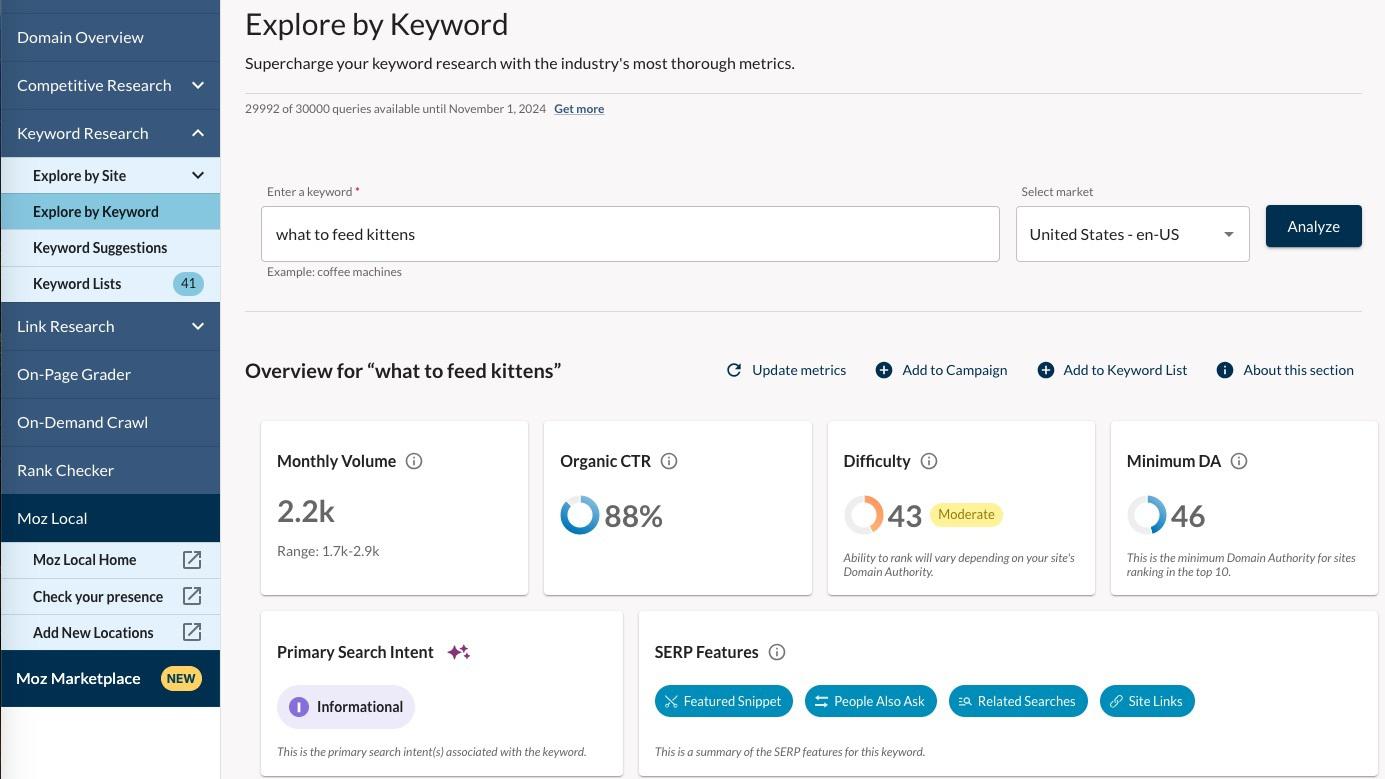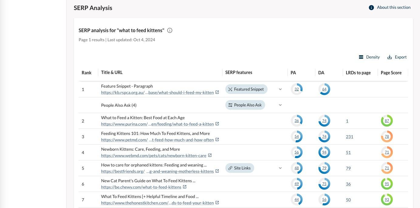 What type of search is this, based on the top 10 results? Given that all 10 pages are educational articles on what to feed a new kitten that include advice, charts, lists, and more, I can conclude that the search intent is informational. This means that product pages or location landing pages are not likely to rank on the first page of Google for this keyword.