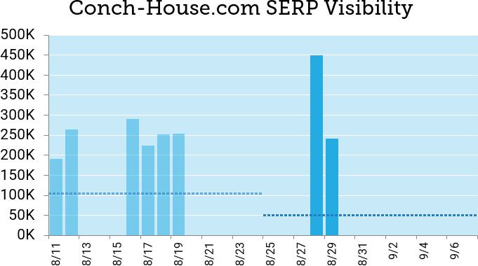 Given the extended rollout, I attempted to look at the difference in visibility for individual domains for the 14 days before and after the start of the rollout (which helps smooth out single-day outliers and keeps the days of the week consistent across both sides). One “loser” that immediately popped up was Conch-House.com, with nearly a 50% visibility loss in our data set. I admit, I even got a little judgmental about the hyphen in the domain name. Then, I looked at the daily data: