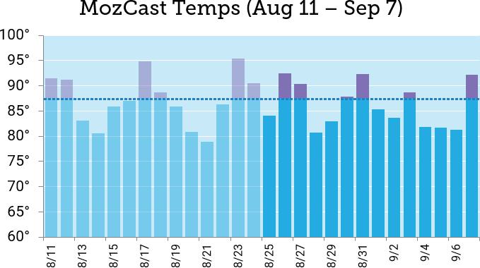 The dotted blue line shows the 30-day average for the period prior to the start of the update, which came in at 87°F. Ranking flux actually peaked on August 23 above any day of the update rollout. To make matters worse, we had to remove August 8-9 from the 30-day average, because Google’s data center outage completely disrupted search results.