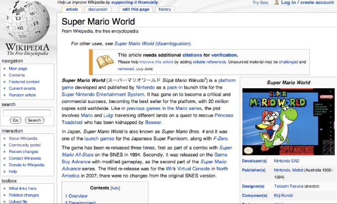 Aside from content, this page is laid out well. The topic of the page is stated in the title tag (Super Mario World – Wikipedia, the free encyclopedia), URL (http://en.wikipedia.org/wiki/Super_Mario_World), the page’s content (the page heading, “Super Mario World”), and within the alt text of every image on the page.