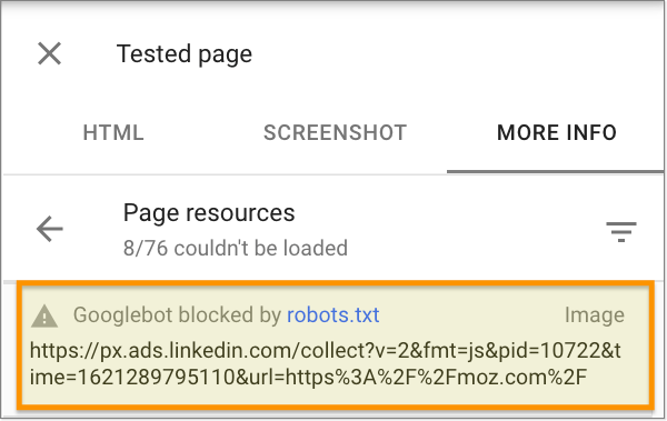 The best practice is to visually inspect your robots.txt file and make sure you don't block any important image files, CSS, or JavaScript files that would prevent search engines from rendering your page. You can also use Google's URL Inspection Tool to discover any blocked resources, as shown here.