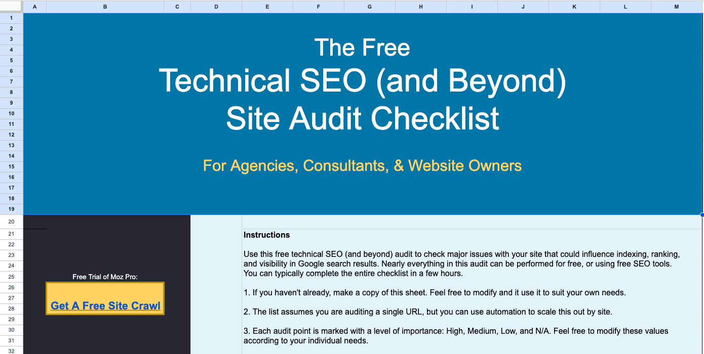 This audit spreadsheet is downloadable and you can modify it for your own purposes. If you're an agency or consultant, you can incorporate it into your own audit process, or if you're a website owner, you can quickly check the important SEO elements of your own site.