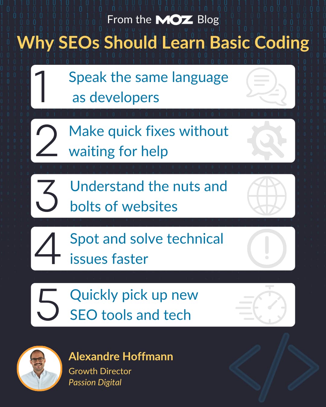 If you ask whether developers should learn SEO or SEOs should learn to code, my answer is always the latter. To execute effectively, SEOs need to understand how websites are built and be able to make basic technical changes themselves.