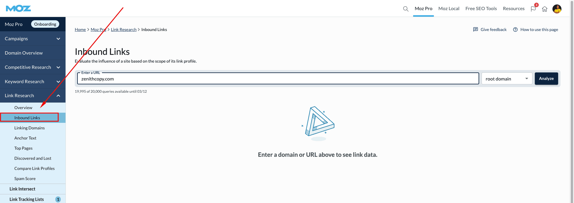 Log into your Moz Pro account and click Inbound Links under Link Research.