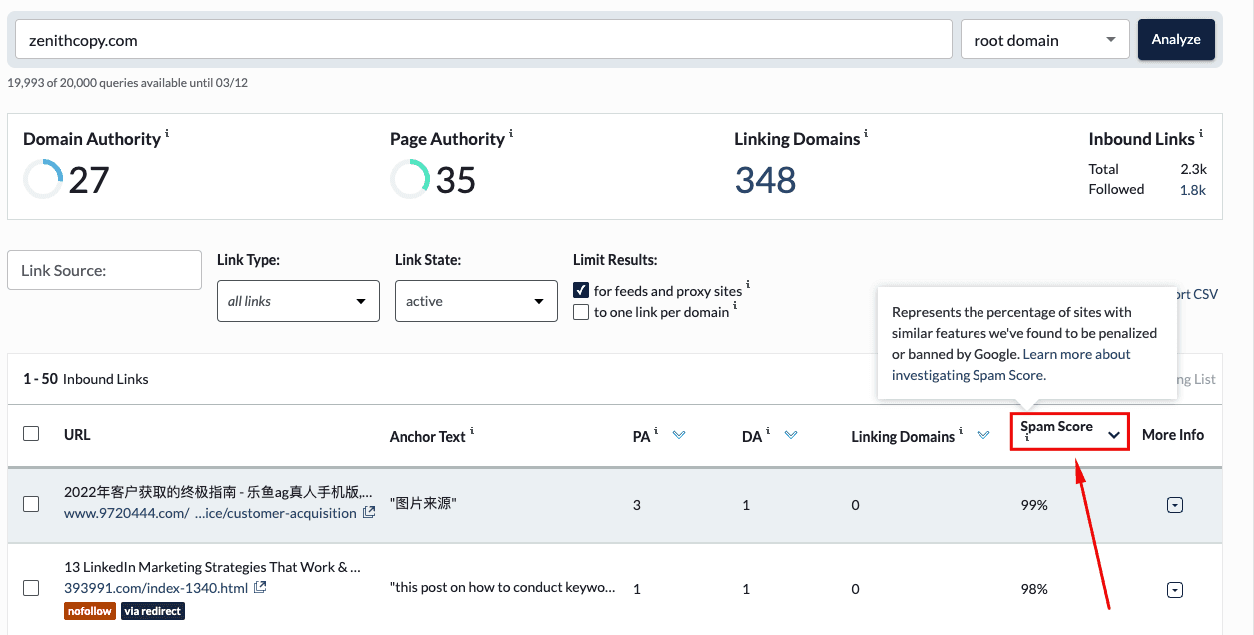 Low-quality or spammy backlinks can harm your rankings. Use Link Explorer to find links from suspicious sites, such as link farms, irrelevant directories, or spam-heavy domains. Filter by Spam Score to view spammy sites linking to you.