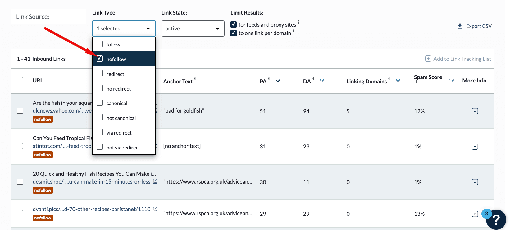 When the results populate, scroll down to Link Types and select follow or nofollow from the drop-down menu.